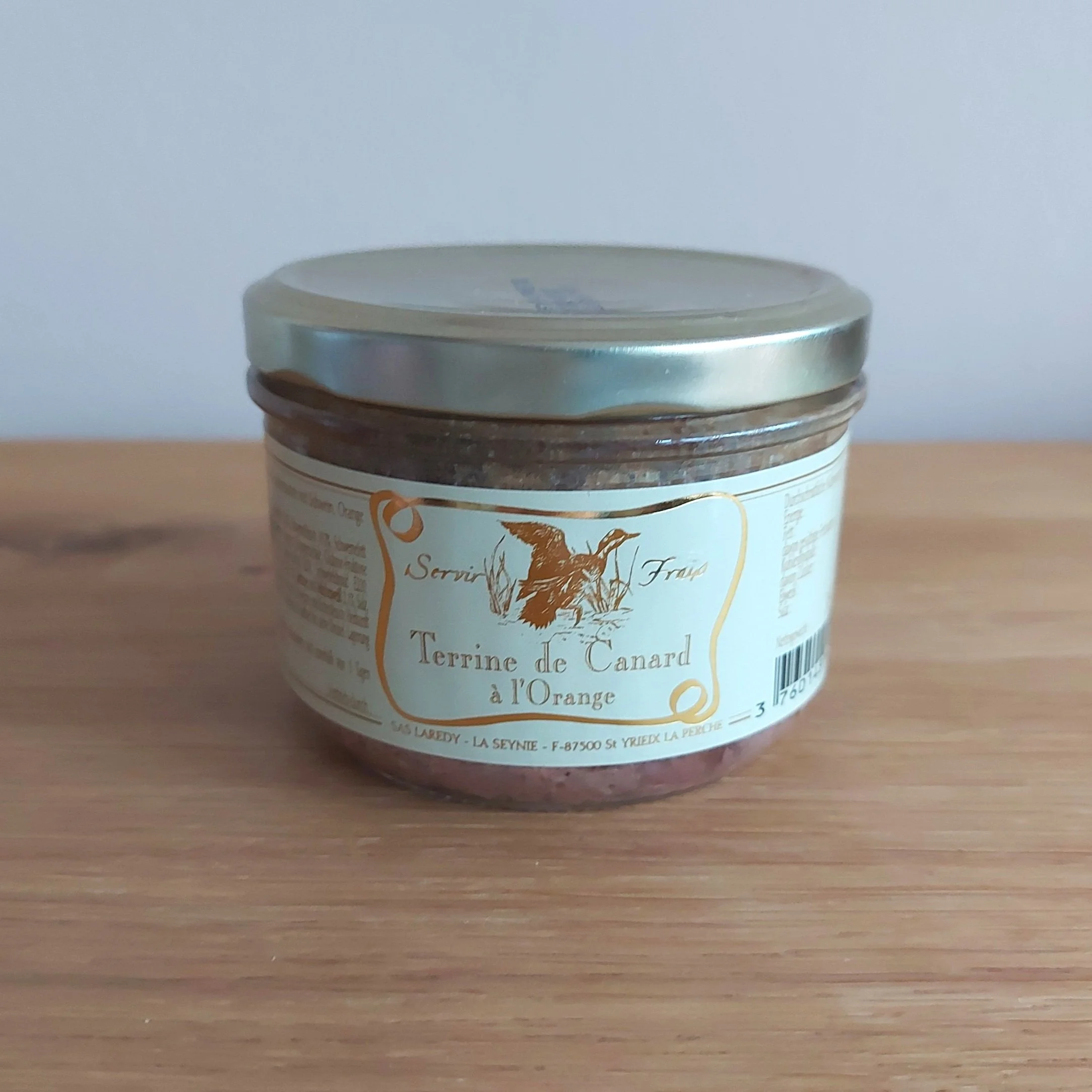 Zutaten : Entenfleisch 25%, Schweinefleisch 19,7%, Schweinefett 13,2%, Schweineschwarte 7%, kandierte Orangen (Orangenschale, Glucose-Fructose Sirup, Zucker, Konserverungsmittel: Kaliumsorbat E202, Schewelfedoixid E220, Säuerungsmittel: Zitronensäure E330) 2,5%, Wasser, LAKTOSE, MILCHEIWEIß 0,8%, EI, Salz, Armagnac, Orangenlikör 0,9%, natürliche Aromen. Schweine und Entenfleisch: Herkunft Frankreich.